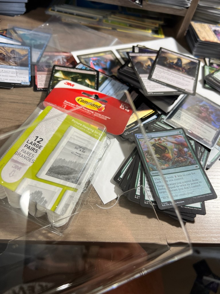 1. You’ll need TWO pairs of Large 3M Command Strips and ONE DeXquire deck rack.2. Install a pair of command strips on each end of your DeXquire deck rack, per the instructions, leaving the wall side of the pair covered for now. 3. Before removing the covering, select a place to hang your DeXquire, utilizing a level to ensure best display. You can mark the hanging points on the wall with a pencil, if desired, for ease of reference once you’re ready to install. 4. Remove the backing on the wall side of the 3M strip.5. Place your DeXquire where desired on your wall, pressing and holding the Command Strips firmly as instructed, noting you should allow for about three inches of space between it and any object above it, including other DeXquire racks, so it’s easier to place and remove your favorite decks.6. Add your favorite decks, noting that one DeXquire deck rack can hold up to SEVEN TCG decks as deep as 100 cards, even those that are double-sleeved!7. Repeat as necessary to showcase your best TCG decks or as wall space allows and make sure to order enough DeXquire deck racks as you may need! Send us YOUR awesome DeXquire displays for inclusion on our site and socials! Email a photo to dexquire@outlook.com!